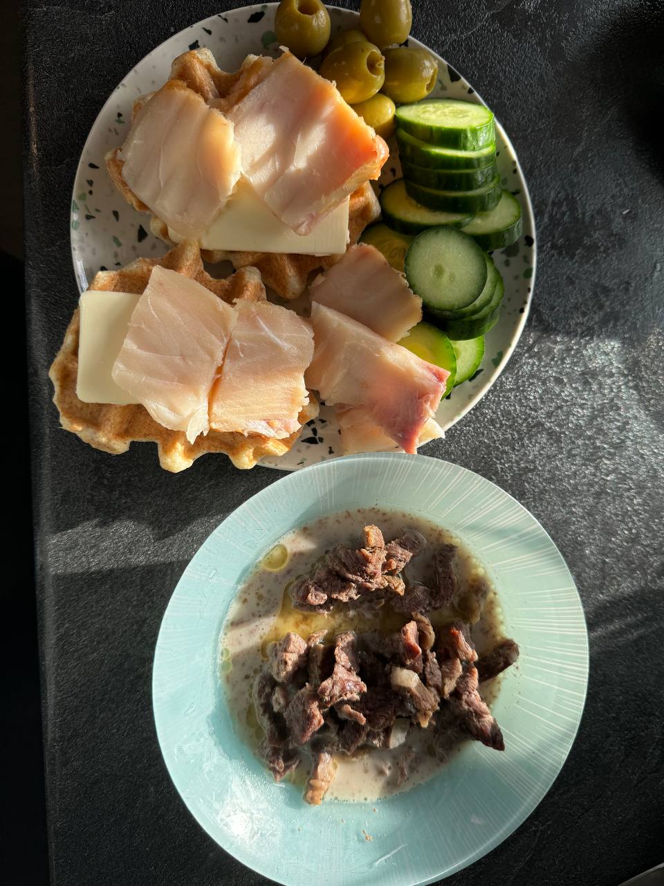 На завтрак в 12:00 - говядина тушеная типа бефстроганов, добавляла сливки 33%) кетовафли с смальцем, масляной рыбой, оливки и огурец. Ужин - рыба под шубой по рецепту, оливки, укропа горка, лимонный смузи и выдержанный сыр (он получился как десерт для меня почему-то))))