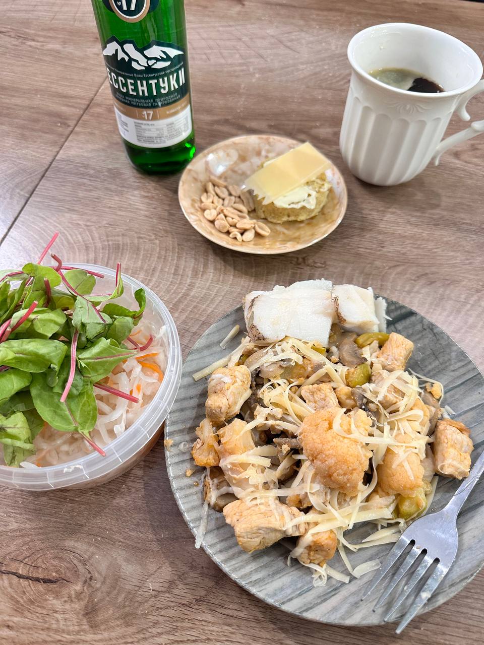 Добрый день 🌸 Омад ⬇️ Рагу из свинины, цветной капусты и кабачка, сало, квашеная капуста+мангольд, на десерт кето хлеб с маслом и немного арахиса