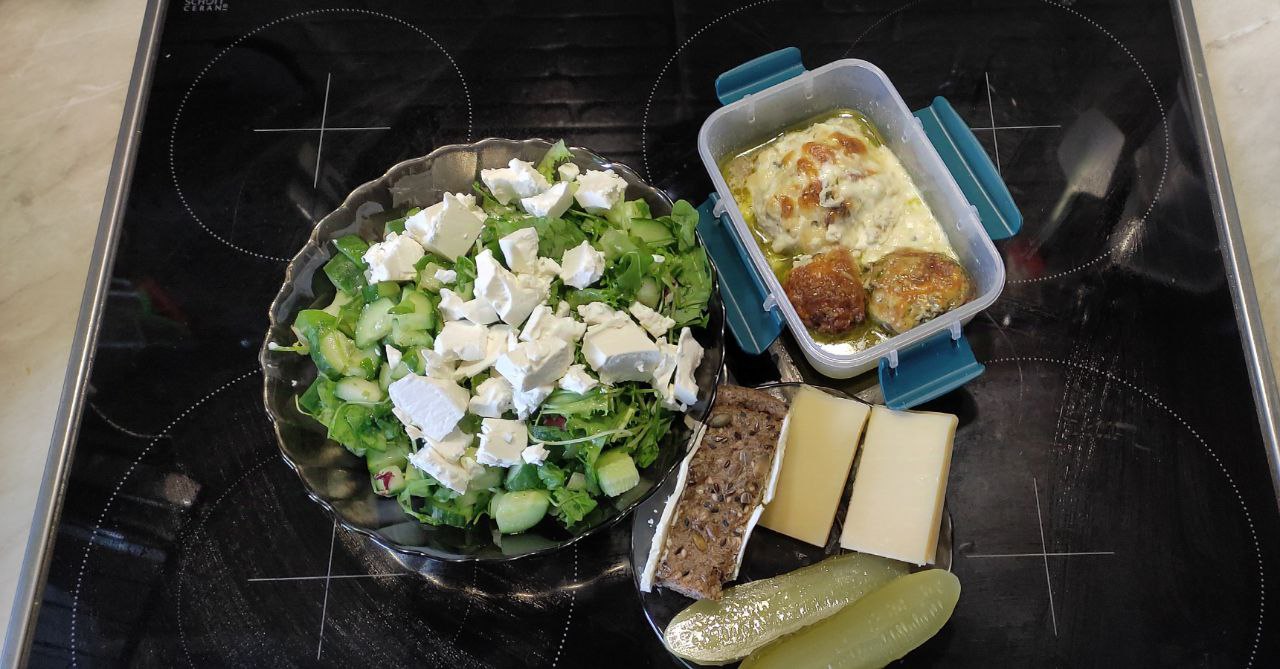 Салат(смесь из рукколы/фриссе/радичио+свежий огурец, заправка из соли со специями и льняное масло(Оливковое в пути,), сверху сыр фетакса рассольная, все посыпала 2ст.л. дрожжей, 2 фаршированных шампиньона+куриный тефтели(по рецептам Оли), кусочек хлеба (рецепт Дианы)с маслом сливочным и твердым сыром Сармич, минеральная вода, вода с уксусом в течении дня.