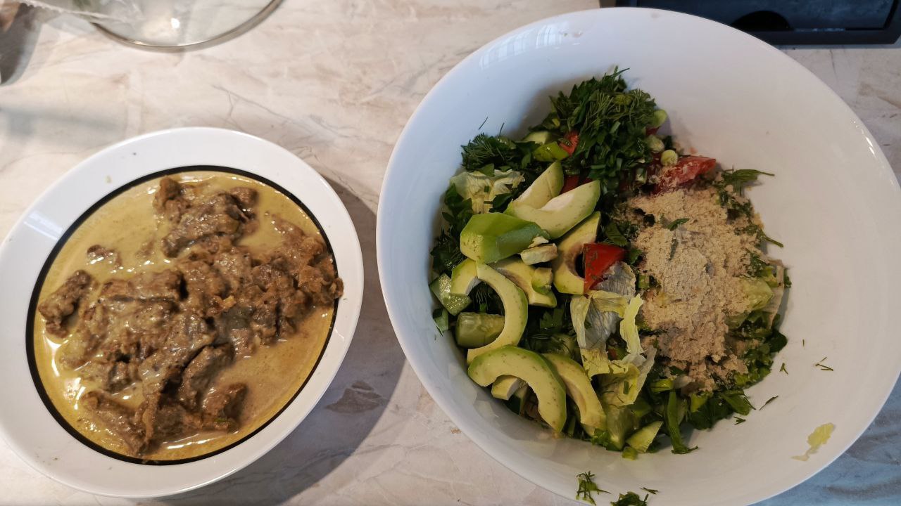Один прием еды. Гуляш из говядины на масле гхи + сливки 33%. Салат из рукколы, лука, укропа, кинзы, 1/3 огурца, 1/2 помидора, 1/2 авокадо + пищевые дрожжи. + бады, яу, мин вода