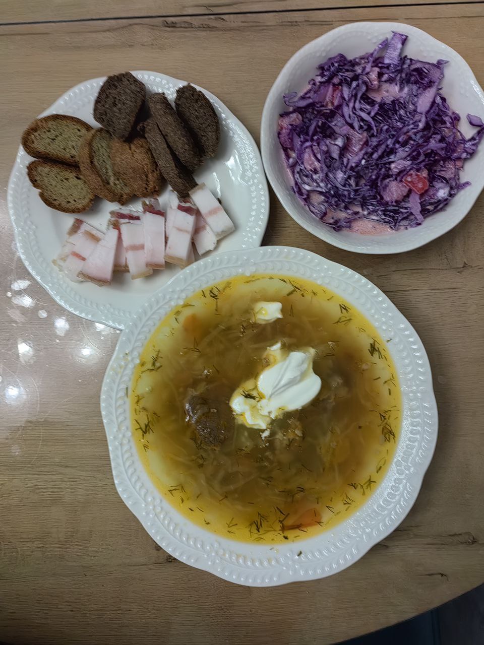 Обед: щи на костном бульоне+сметана 30, салат (краснокачанная капуста+помидор), сало соленое, кетохлеб (хлеб съела 3 кусочка, сало 5 кусочков), какао (сливки 33 и сахзам 1/2 мерной ложки)