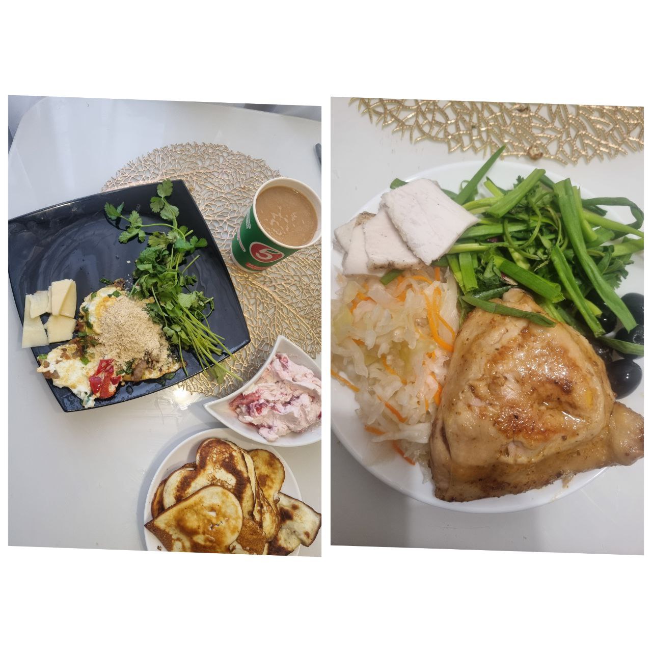 Утро началось с Расторопши, потом яу с минералкой, далее яичница с перцем сладким, салом, зеленым луком, сыр, зелень, пищевые дрожжи, кофе черный из Пятерочки, дома добавила сливки 33, кето блины грамм 100 и маскарпоне с Сах зам и клубникой около 50 грамм. в течении дня яу с минералкой и просто минералка. Ужин : бедро жаренное на слив масле, кваш капуста, сало, маслины, зелень. Кето блины 50 гр. Добавки все пью .