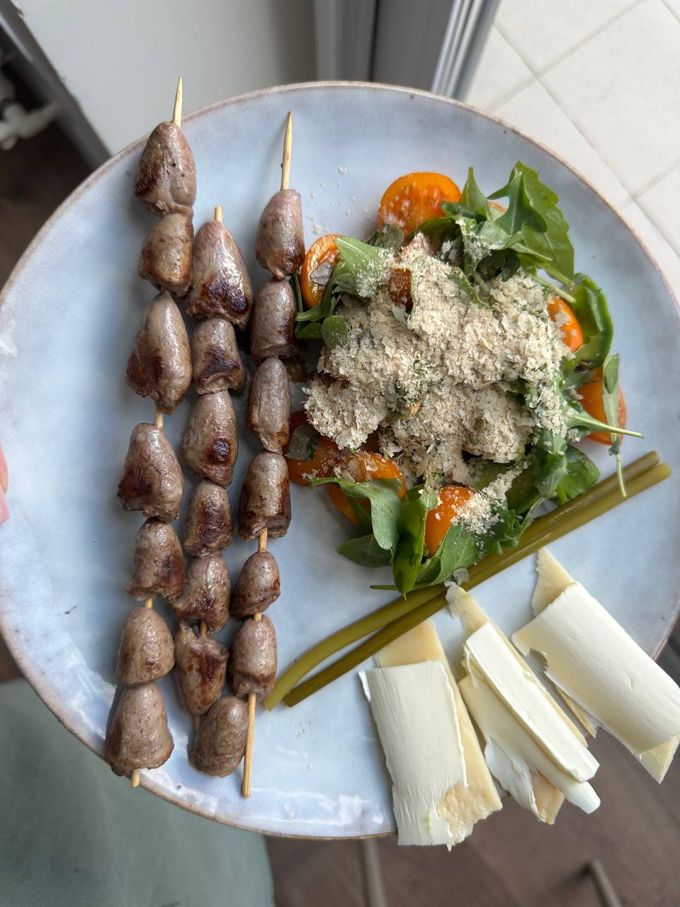 Жареные куриные сердечки, руккола+черри+авокадо+дрожжи. Пармезан с маслом. Не наелась этой порцией, добавила кусок горбуши и ещё пару кусочков пармезана с маслом. И выпила бронекофе в конце.