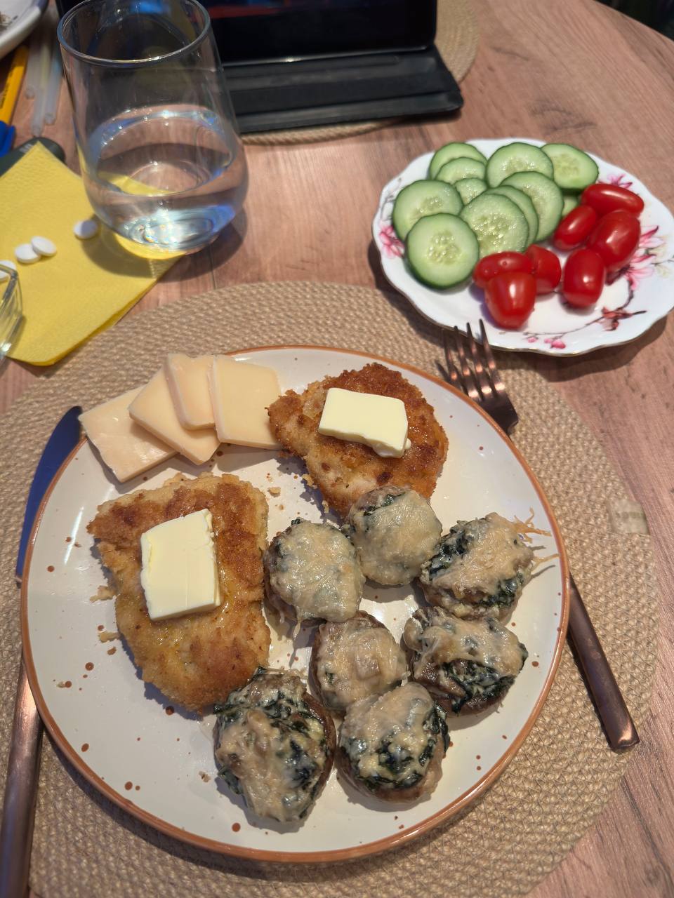 Добрый вечер) сегодня: примерно в 12.00 выпила кофе с кокосовыми сливками. Прием пищи в 17.00: курица в панировке+шампиньоны(все по Олиным рецептам😋), огурец,помидорки черри,сыр и масло(на курице лежит). Наелась от пуза))) полагаю,что сегодня мне больше ничего не надо будет🙃 ЯУ,добавки и бады - все как положено💪