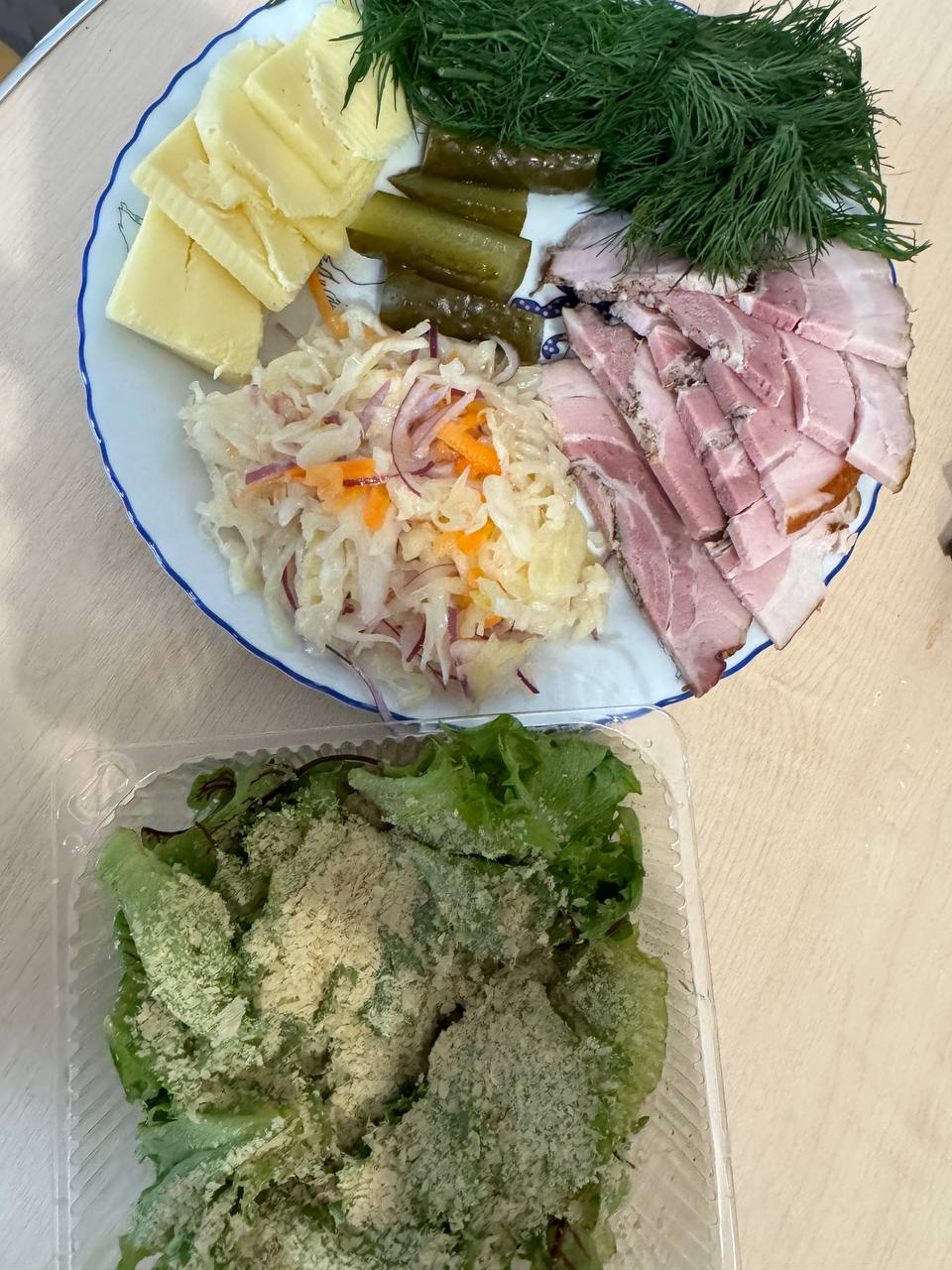 Обед : капуста квашеная ( съела только половину),рулет свиной копченый ( покупала на местном рынке),пучок укропа, сыр с маслом, квашеный огурчик и черный кофе со сливками 33%.