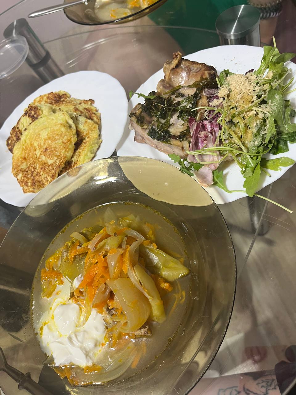 Ужин перцы ( свинина говядина ) со сметаной 25% ребра и салат зелени +дрожжи и ол масло