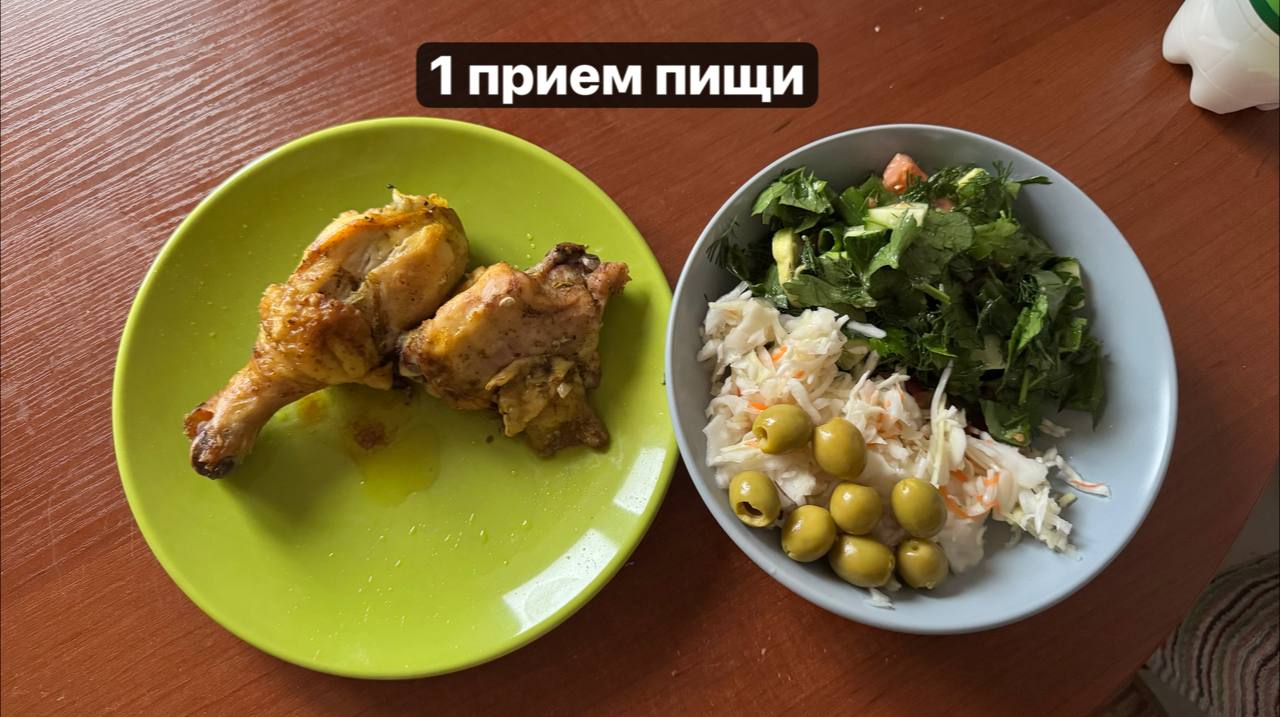 1 пп: жареные куриные запчасти (на сале, с кожурой (цыпа домашняя)), зелень с авокадо, огурец, помидор (заправка оливковое масло + яблочный уксус + розовая соль), оливки, квашеная капуста.