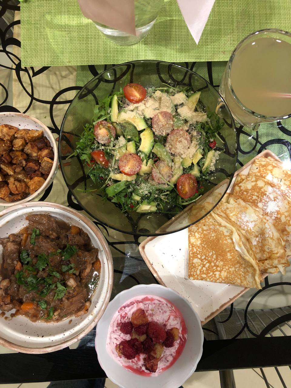 Омад: тушеная говядина с луком и морковью обжарены на сале, присыпаны кинзой. Салат из рукколы, укропа, кинзы, овакадо 1/2, черри, оливковое масло , лимон и дрожжи. Блинчики по Олиному рецепту 🔥 маскарпоне с малиной. Да, еще шкварки и яу