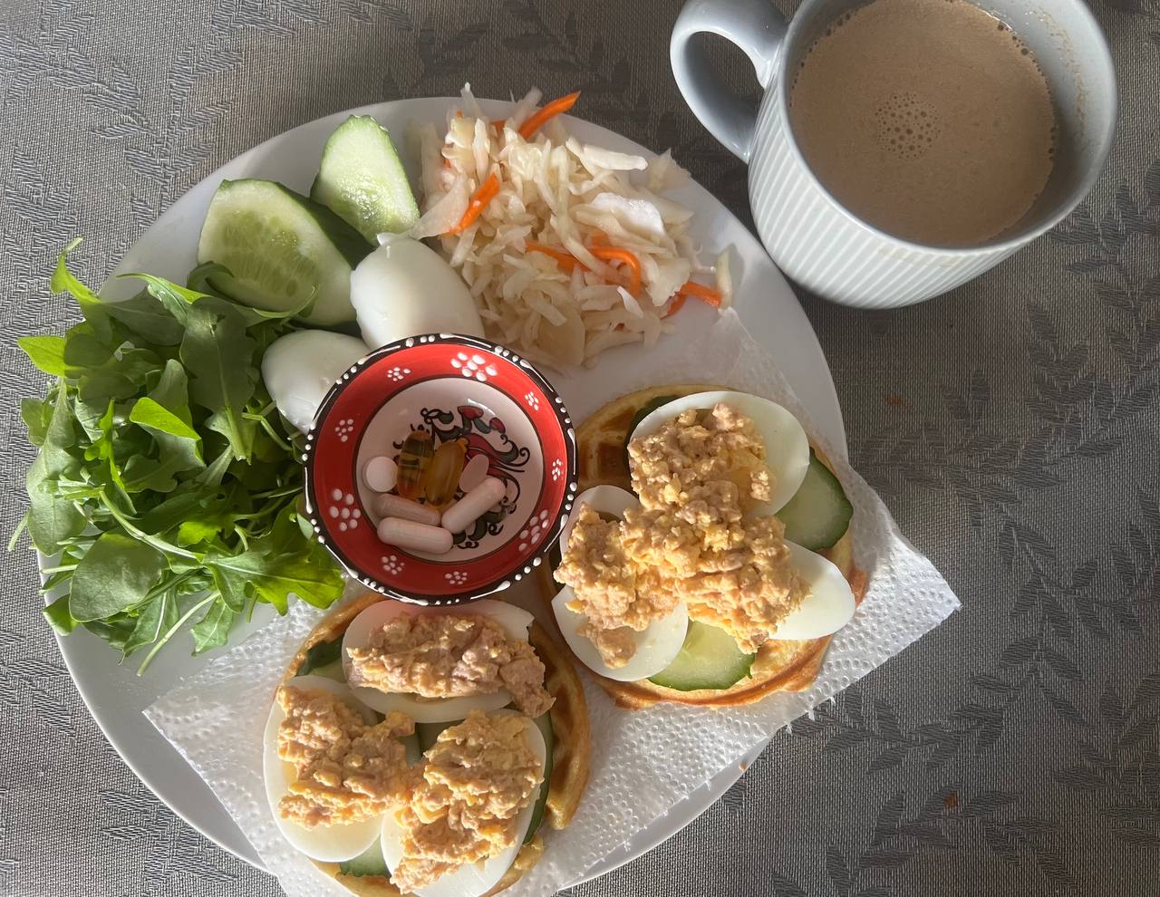 Завтрак - вафли (рецепт нашла в Олиной группе и вафельницу мини заказала тоже по рекомендации, получились с первого раза) на вафлях огурец, яйцо 2 шт. и печень трески натуральная с кусочком сливочного масла, зелень, капуста, кофе со сливками и сахзамом. От сливок и зама попробую с завтра отказаться - сегодня специально сливки не купила🫣