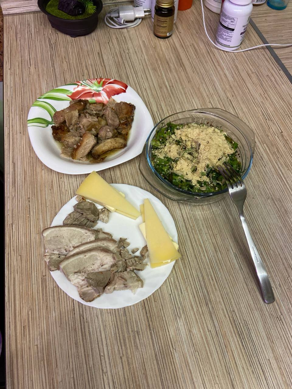 Свинина шея+ бекон в духовке, салат руккола+петрушка+укроп+1 соленый огурец+семечки и дрожжи с ОМ, сыр твердый гойя+ масло слив+ чашка бульона, в котором варилась грудинка. Добавила 1ч.л. бальзамического крема. Все добавки и водный режим соблюдаю