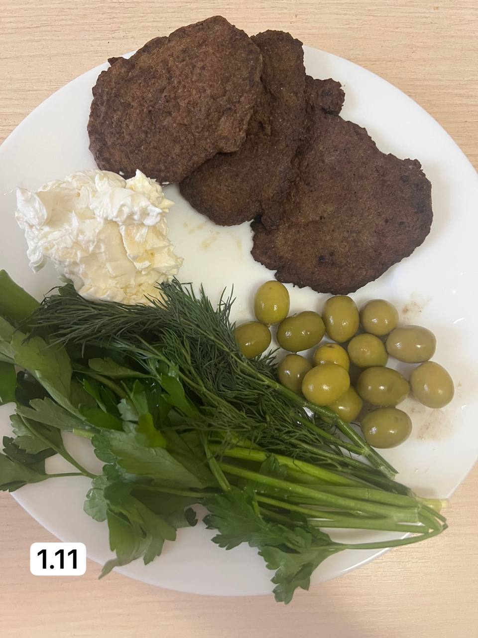 Мой омад: три оладушки из печени на сливочном масле, оливки, сыр творожный с чесноком, зелень. (Дрожжи на зелень посыпала после фотки). Десерт: 10г кокосовых чипсов. На запрещенку не тянет, хотя она перед глазами (шоколад, бананы, сахар, печеньки).