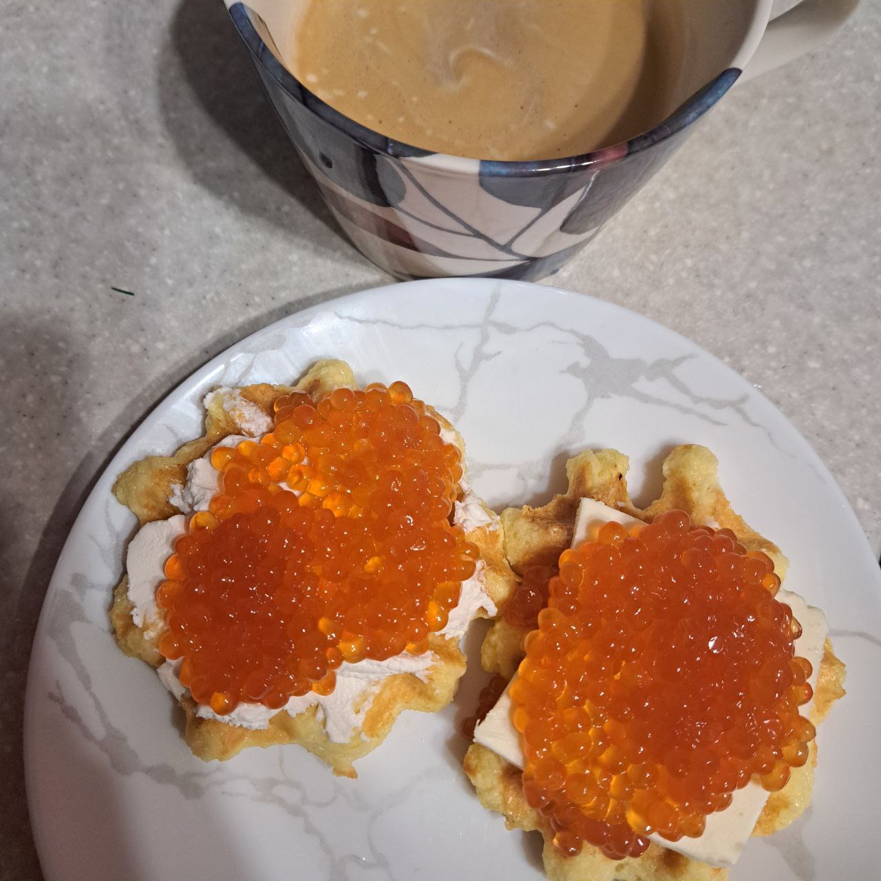 Завтрак: вафли с икрой (одна с маслом, вторая со сливочным сыром)+ кофе со сливками