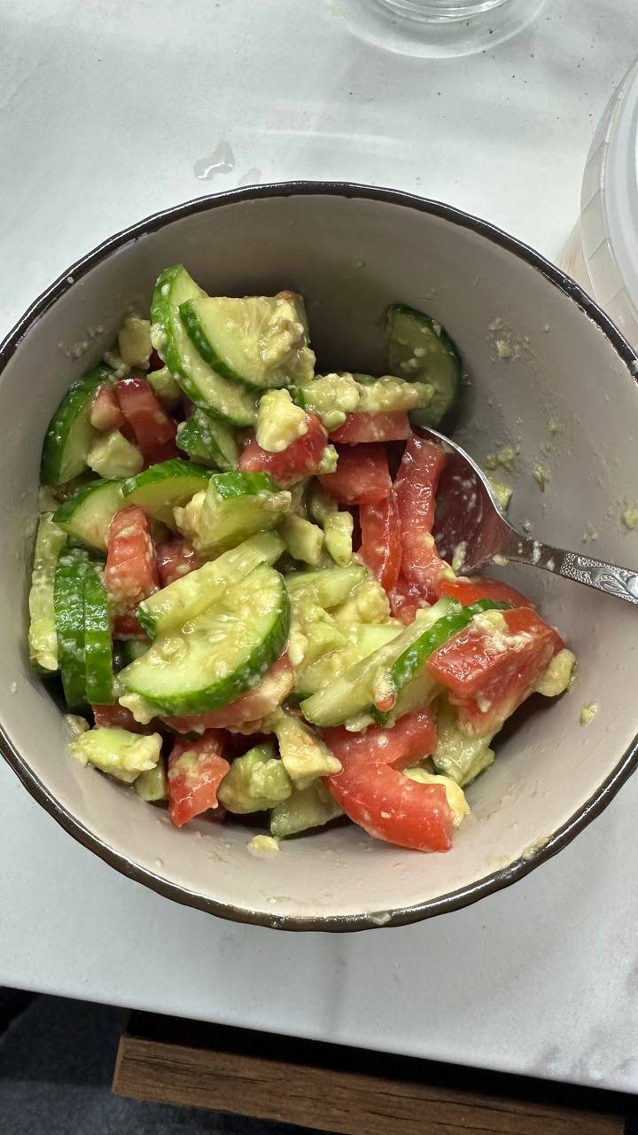 Квашеная капуста, 2 ножки с кожей жареные на сливочном масле. Салат из целого авакадо хаос, огурец, помидор(без заправки)