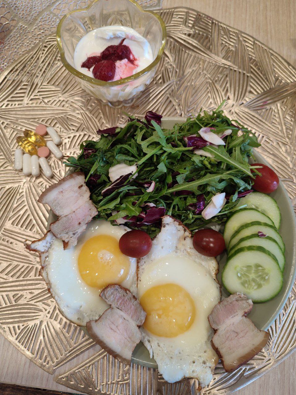 Завтрак яичница , грудинка собственного приготовления. Огурец, черри ,зелень .десерт чуть тв. Сыра со сливками , 3 клубнички .