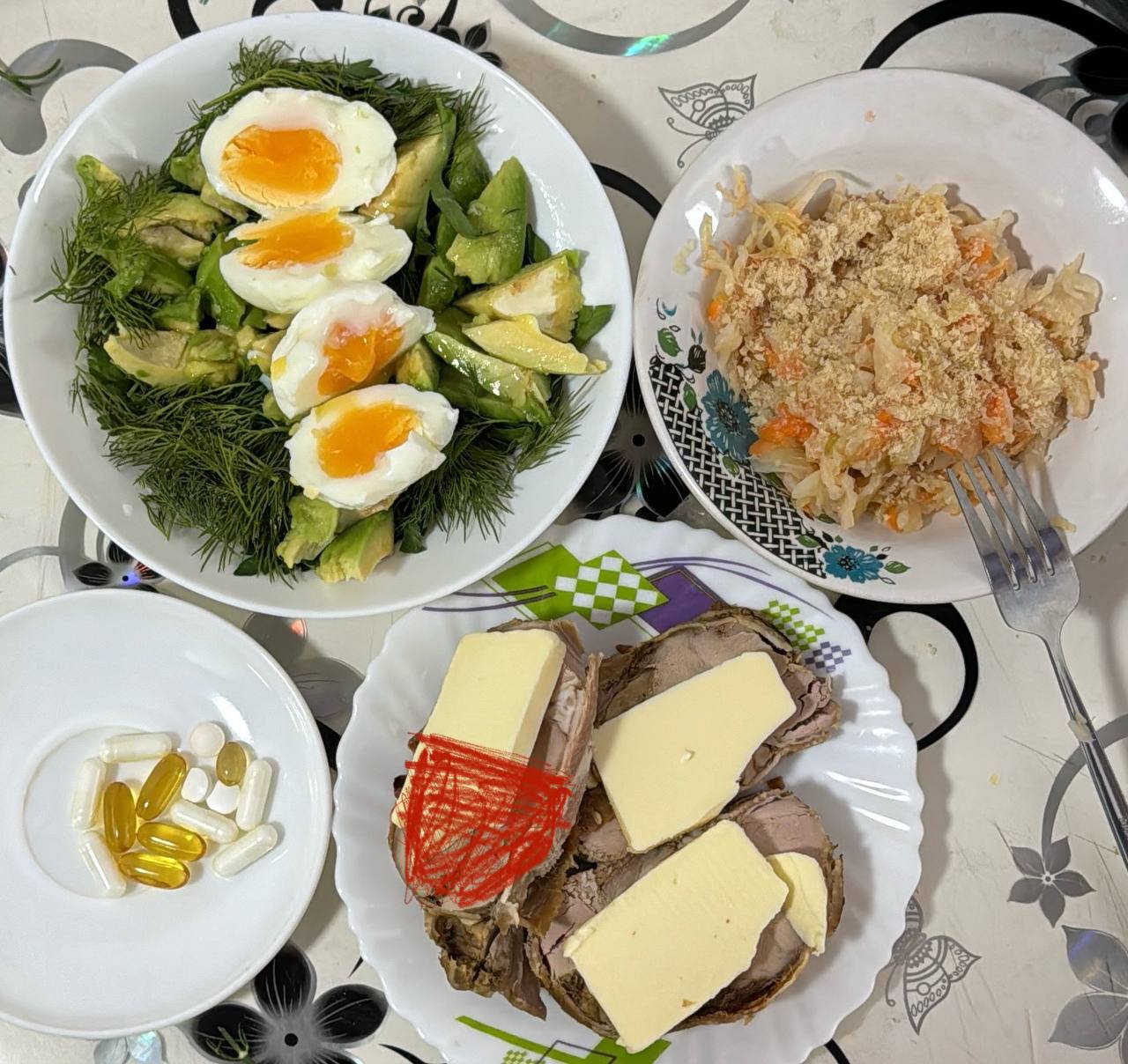 Укроп,петрушка, соль, олив масло, яйцо, авокадо. Квашена капуста, дрожжи Мясо со слив маслом(то что закрашено не доела) Электролиты, яу