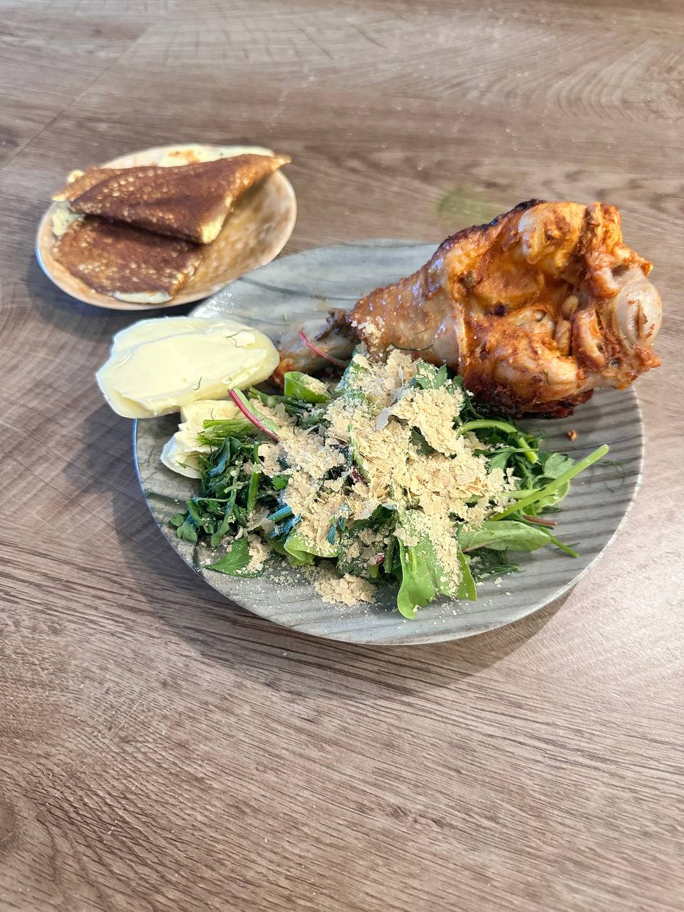 Прекрасного дня 🌸 Омад⬇️ Плечо индейки с кожей, немного сыра с маслом, мангольд/петрушка/укроп с дрожжами, 2 блинчика по рецепту ❤️