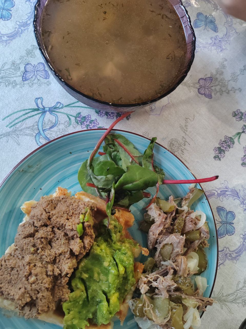 Добрый день. Жирный бульон с грудинкой говяжей и укропом, солёный огурчик. Кето вафля с печёночный паштетом и авокадо, мангольд. Какао со сливками. Лимонный смузи.