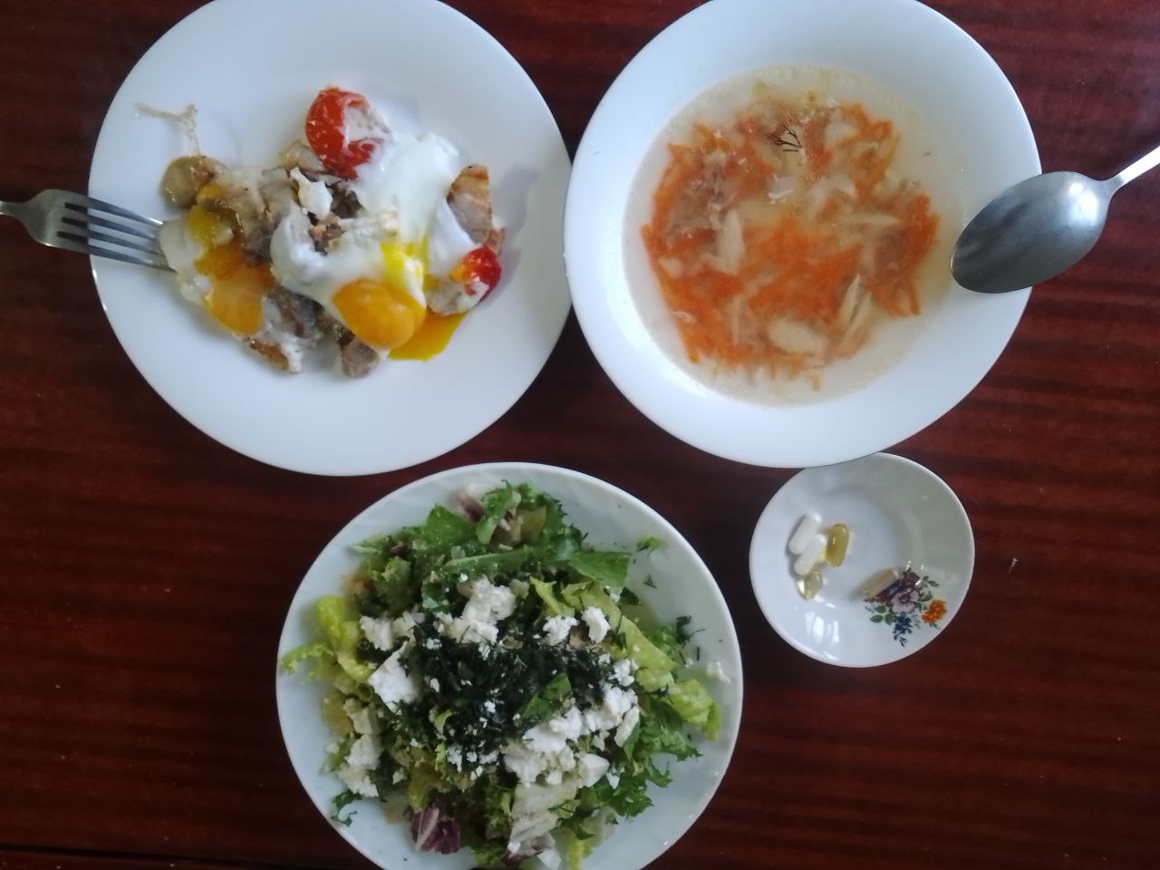 Бульон на домашней курице,2 яйца со свининой и ложка горчицы. Салат зелень, помидор, о.масло, брынза. Фото составов горчицы и брынзы
