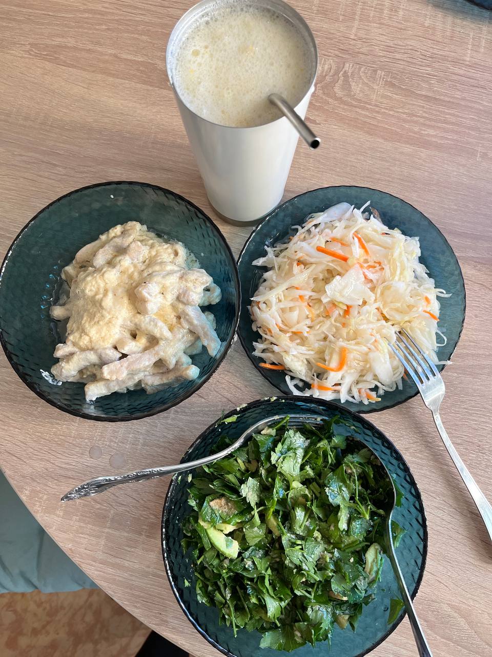 Мой Омад: свинина в сливках, петрушка с дрожжами, уксусом и ом, с авокадо. Капуста квашеная с ом. Лимонный смузи с калием. Три бразильских орешка (не на фото). Открытие маслосыр. Утром расторопша, электролиты.