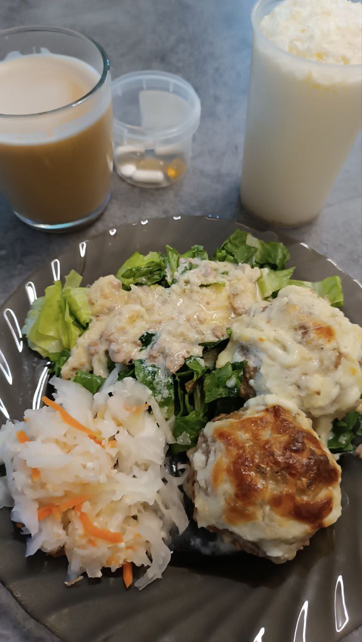 Капуста квашенная, салат ромейн, колобочек ( фарш свинина + говядина домашний, риккота, яйцо) залила моцареллой со сливками, лимонный смузи с капелькой сливок , кофе с ложкой столовой сливок, все добавки по расписанию