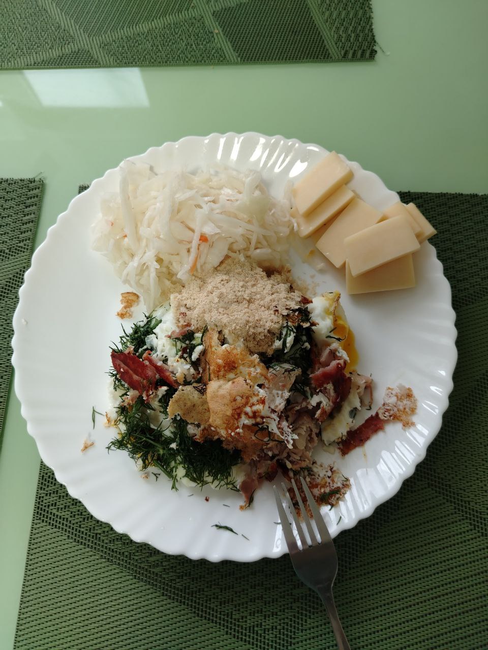 Три жареные яйца на трех полосках бекона, укроп, капуста квашеная и сыр, кофе с сливочным маслом, и долька шоколада разрешенного