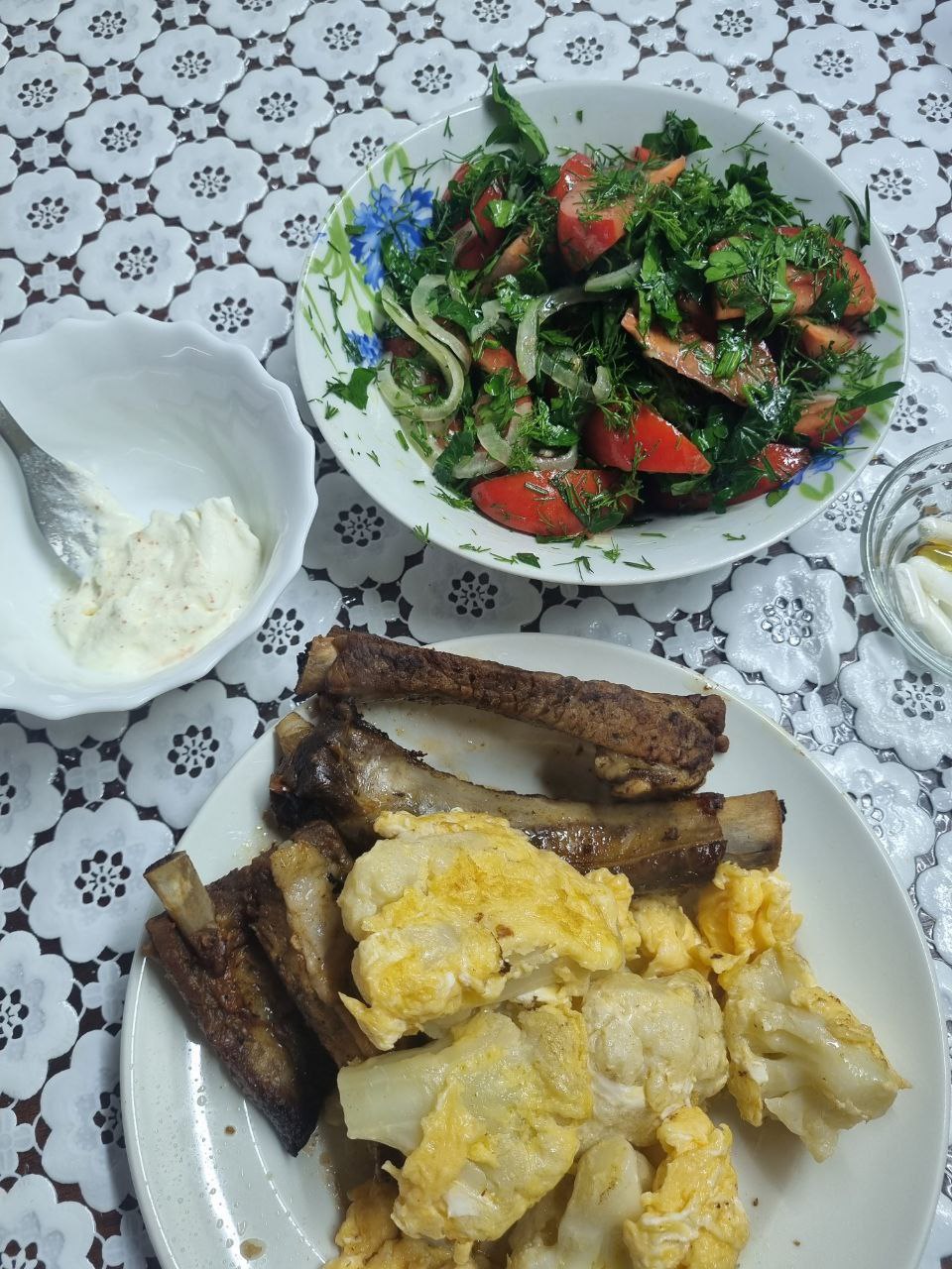 Омад. Ребра свиные, капуста цветная с яйцом, салат зелень и 3 не больших помидора, лук+оливковое масло. Ложка сметаны 30%. Бады и после еды уксус