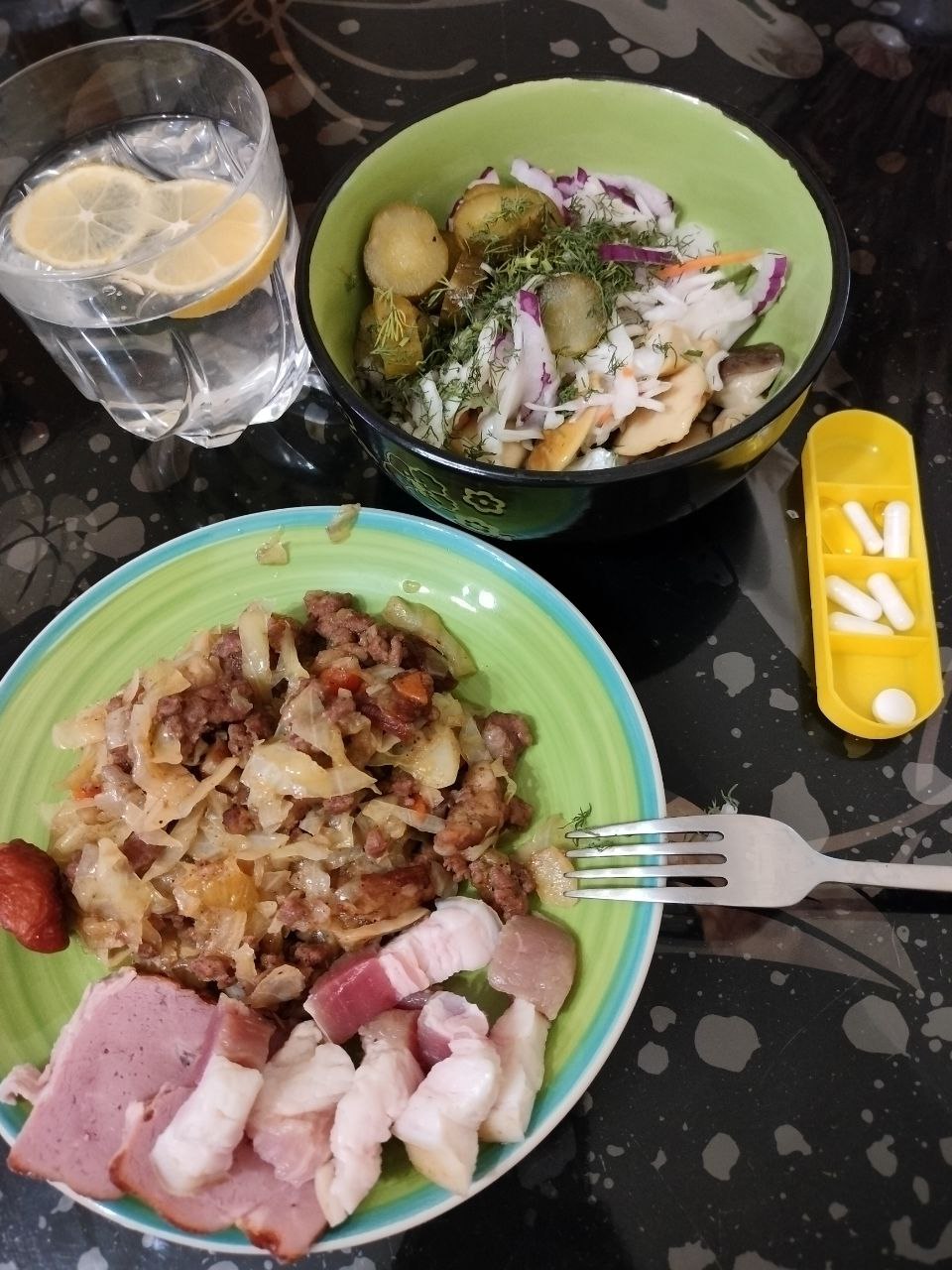 Добрый вечер. Мой Омад, капуста по рецепту Ольги, квашеная капуста+красный лук+домашние грибочки, вода с лимоном. Открылась кусочком сыра и масла.