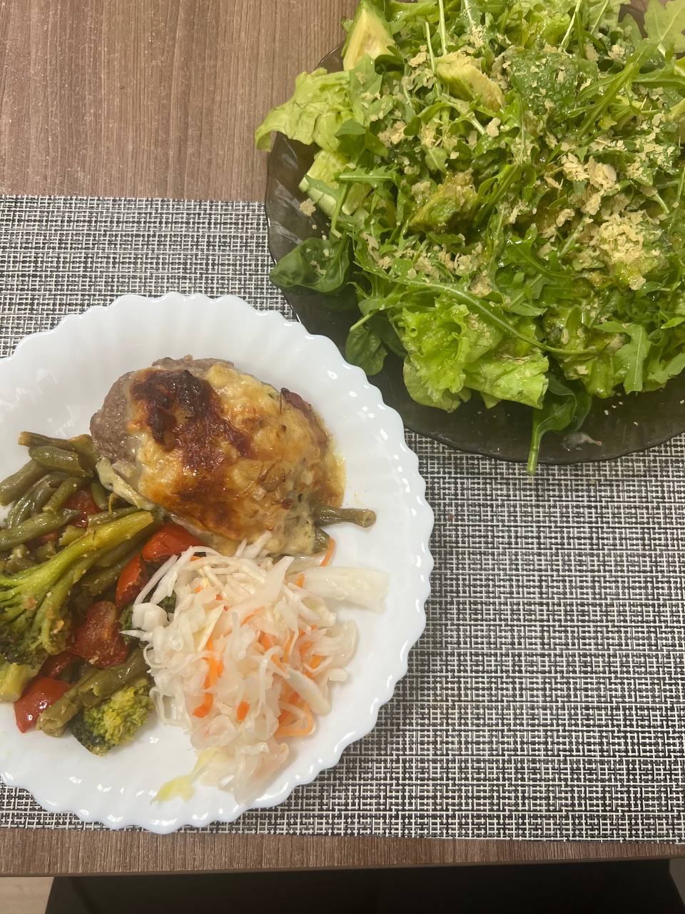 Омад: огурец, шпинат (термически обработанный, маленькая горсть), руккола, пару листков салата, укроп, авокадо, полито оливковым маслом, пищевые дрожжи); тушеные на оливковом масле овощи(стручковая фасоль, брокколи, 1/2 помидора сливки); кето-бургер (начинку жарила на масле гхи); квашеная капуста (без сахара в составе)