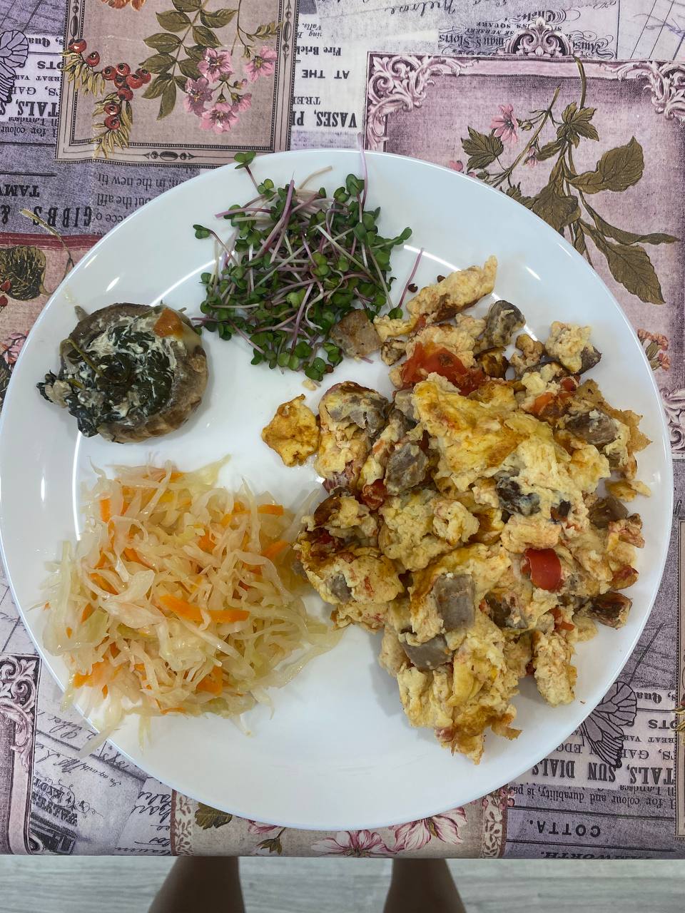 Обед: омлет с помидором и копченым мясом, микро зелень, квашеная капуста, один гриб по вашему рецепту ( его не съела, наелась)