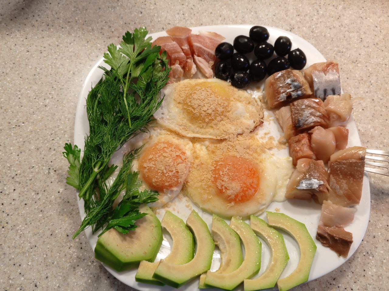 Мой прием пищи сегодня:3 яйца, перед подачей посыпала ложкой дрожжей, сало, авокадо, зелень, оливки, скумбрия с/к(просто мечтала о ней)). На десерт кофе со сливками 35% и сахзам. Добавки, бады, ЯУ по графику. Пока есть не хочу, если не смогу побороть голод- на ужин кетобургер и руккола с зеленью со сметаной 40% (ложка), без десертов.