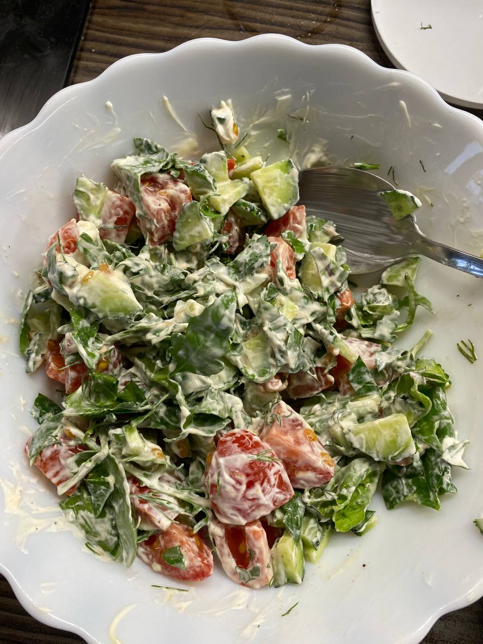 Первый прием пищи: овощной салат и большим количеством зелени, огурцом, помидором и сметаной (30%).