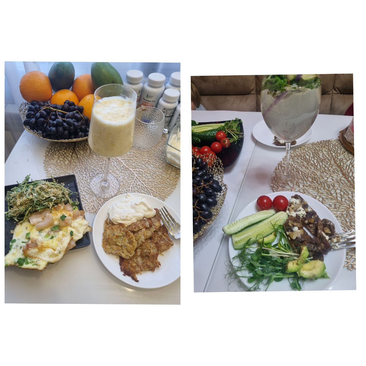 Обед: яу с минералкой , яичница с зел луком на сале , микрозелень с пищевыми дрожжами и сметаной, кабачковые оладьи кето со сметаной и чесноком и лимонный смузи.