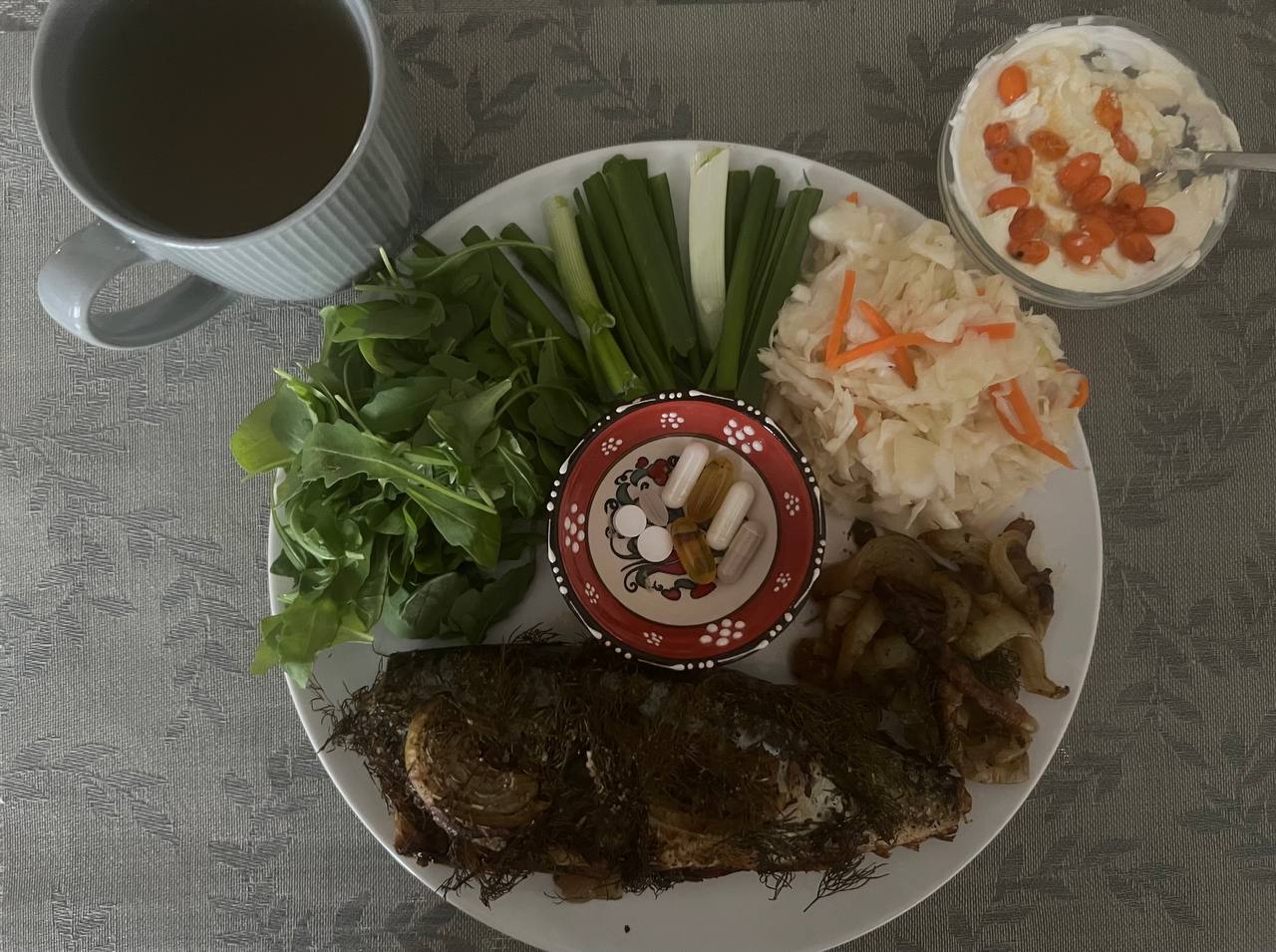 Запеченая скумбрия с луком и сливочным маслом. Зелень, квашеная капуста. Чай ромашковый и первый раз захотелось десерт - маскарпоне 2 ст.л с 1 ст.л. сливок 33%, сахзам и облепиха.