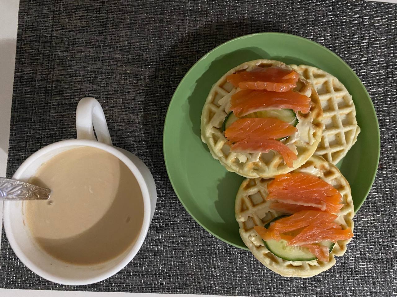 Здравствуйте ! Первый прием пищи после вчерашнего омада в 8:30 кофе со сливками, кето вафли по рецепту Оли, со сливочным маслом 🧈 82%, форель. Очень сытные наелась 1.