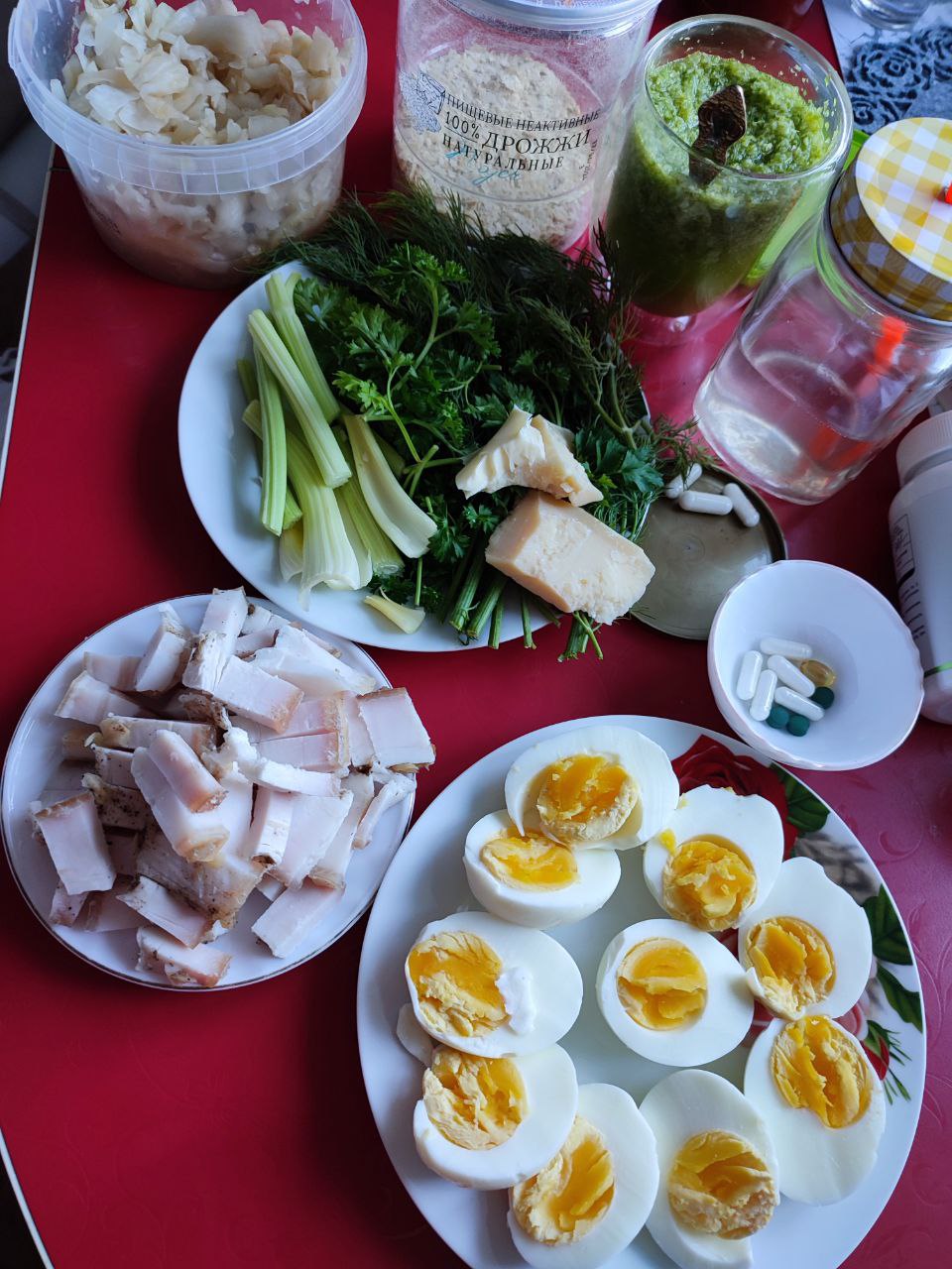 Вечер: яйца (старалась варить правильно) , мало, капуста квашеная, зелень, смузи из зелени, сыр - масло. Ещё позже будет чай) минералы и всё остальное не забываю) готовить поленилась признаю, весь день в конспектах 👍