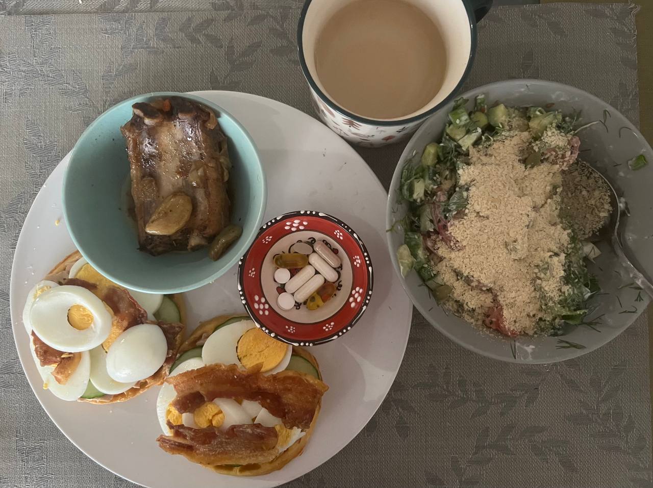 Омад на сегодня - свиные ребра тушеные (доедаю что было), два бутера (один не доела) - вафли, яйцо (2 шт.) огурец, печень трески. Салат половина помидора, огурца много зелени, дрожжи и ст.л. сметаны 30.