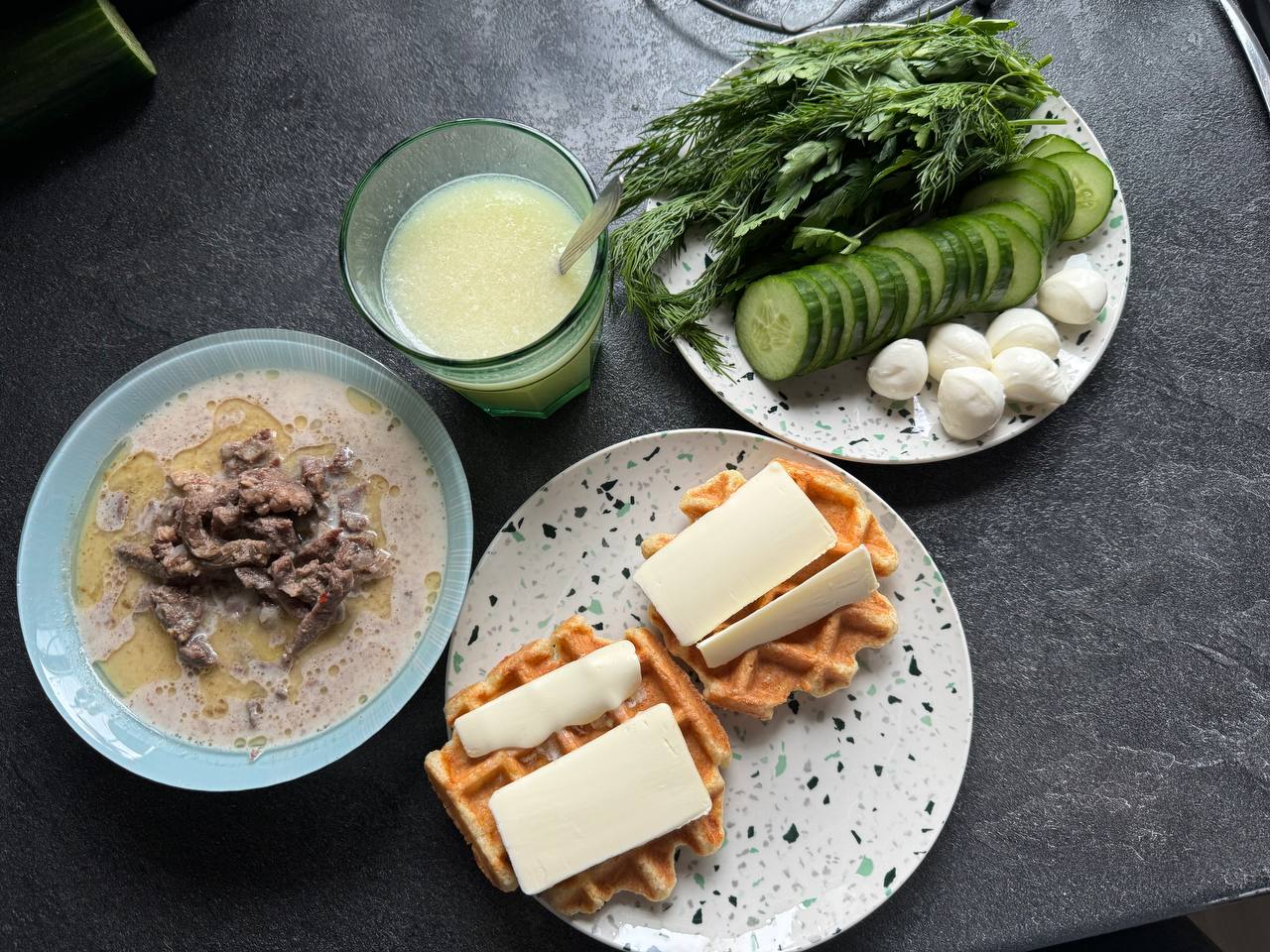 На фото вчерашний прием пищи, говядина тушенная с добавлением жирных сливок, кетовафли, масло, остальное видно)))