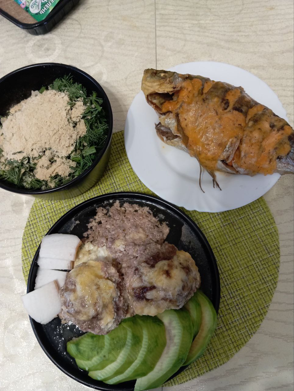Тефтели,сало, авокадо, рыба запечённая под сыром и сметаной 30% , квашеная капуста, зелень, дрожжи,оливыч. Забыла прикрепить фото кусочек сыра с маслом.