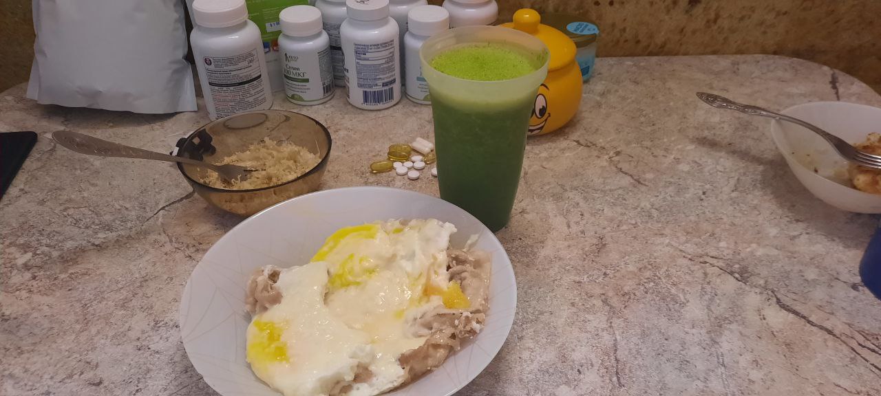 Мой омад. Яичница из 4 яиц, пол пачки бекона, сыра и моцарелы. Немного кквашеной капусты с дрожжами и смузи из зелени. Смузи вкуснятина.