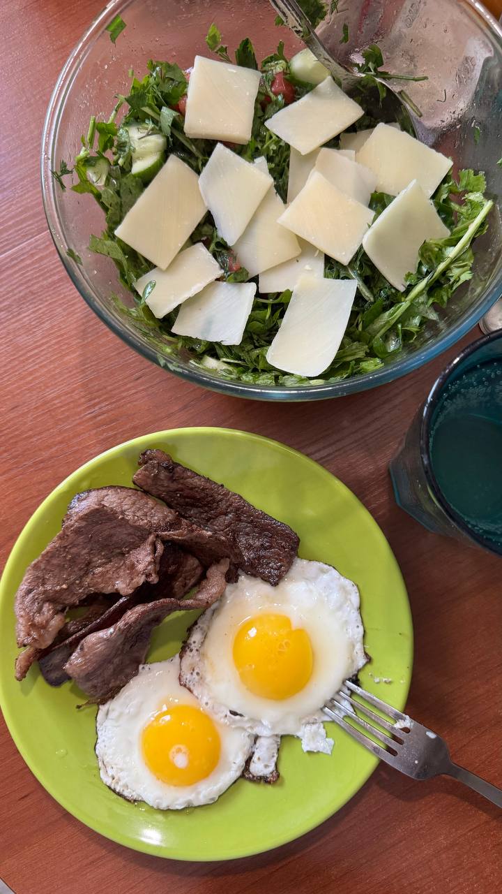 Сегодня омад : бекон из мраморной говядины, 2 яйца, салат (укроп, петрушка, кинза, руккола, помидор, огурец, оливковое масло, пармезан выдержанный)