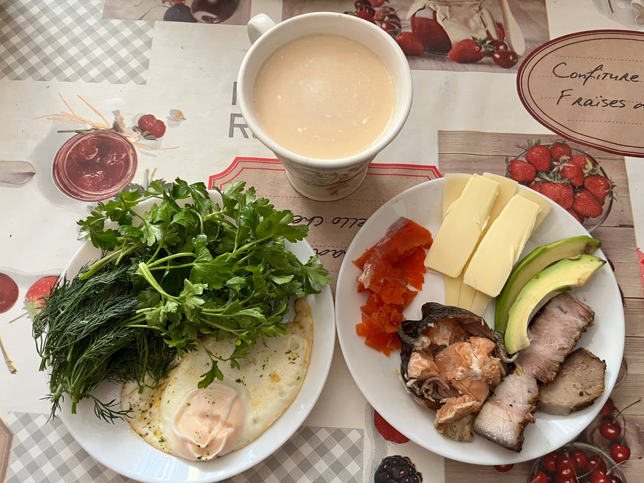 Завтрак: яичница на свином сале, жирная свинина, запеченая форель, малосольная нерка, авокадо, маслосыр, многозелени и зерновой кофе с 33% сливками.