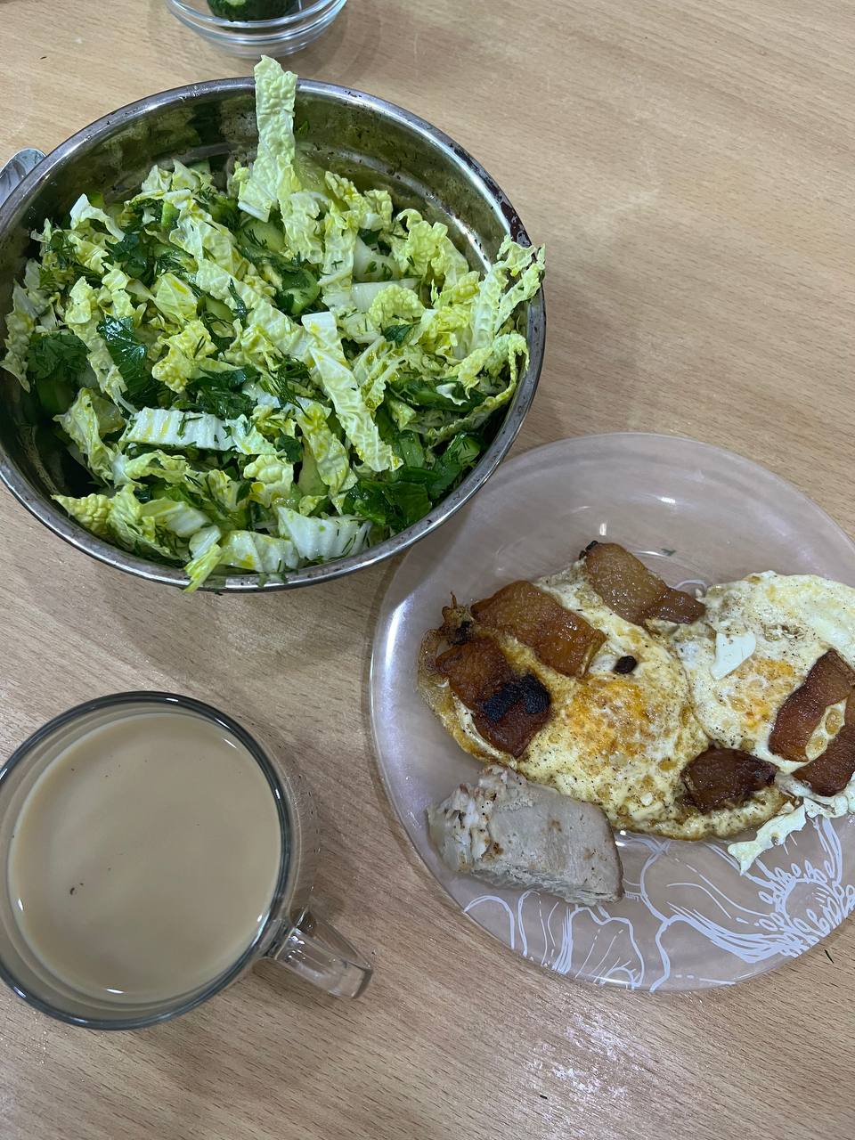 Обед: яичница на сале , салат авокадо, пекинская капуста, укроп петрушка, огурец с маслом авокадо. Салат весь не съела на вечер остался , кофе со сливками 33%.