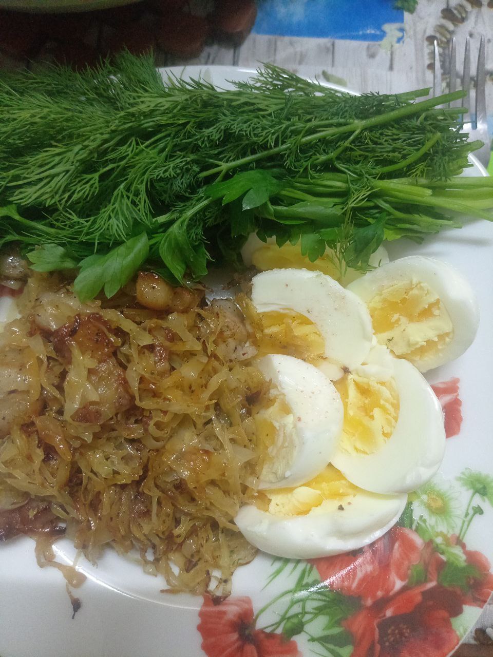 Омад. Хотела тумад, но голода нет вообще. 3 яйца, квашеная капуста с салом. Добавки все по графику