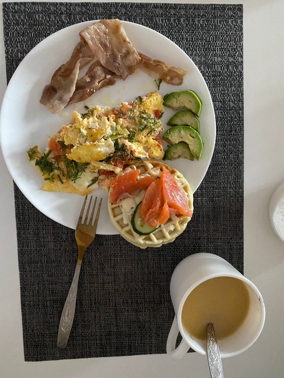 Здравствуйте! Завтрак в 11 утра, вчера последний прием пищи был в 15:00, кофе со сливками, яичница с помидорками, бекон мираторг 2 куска, кето вафля, масло 82%, форель, авокадо 🥑