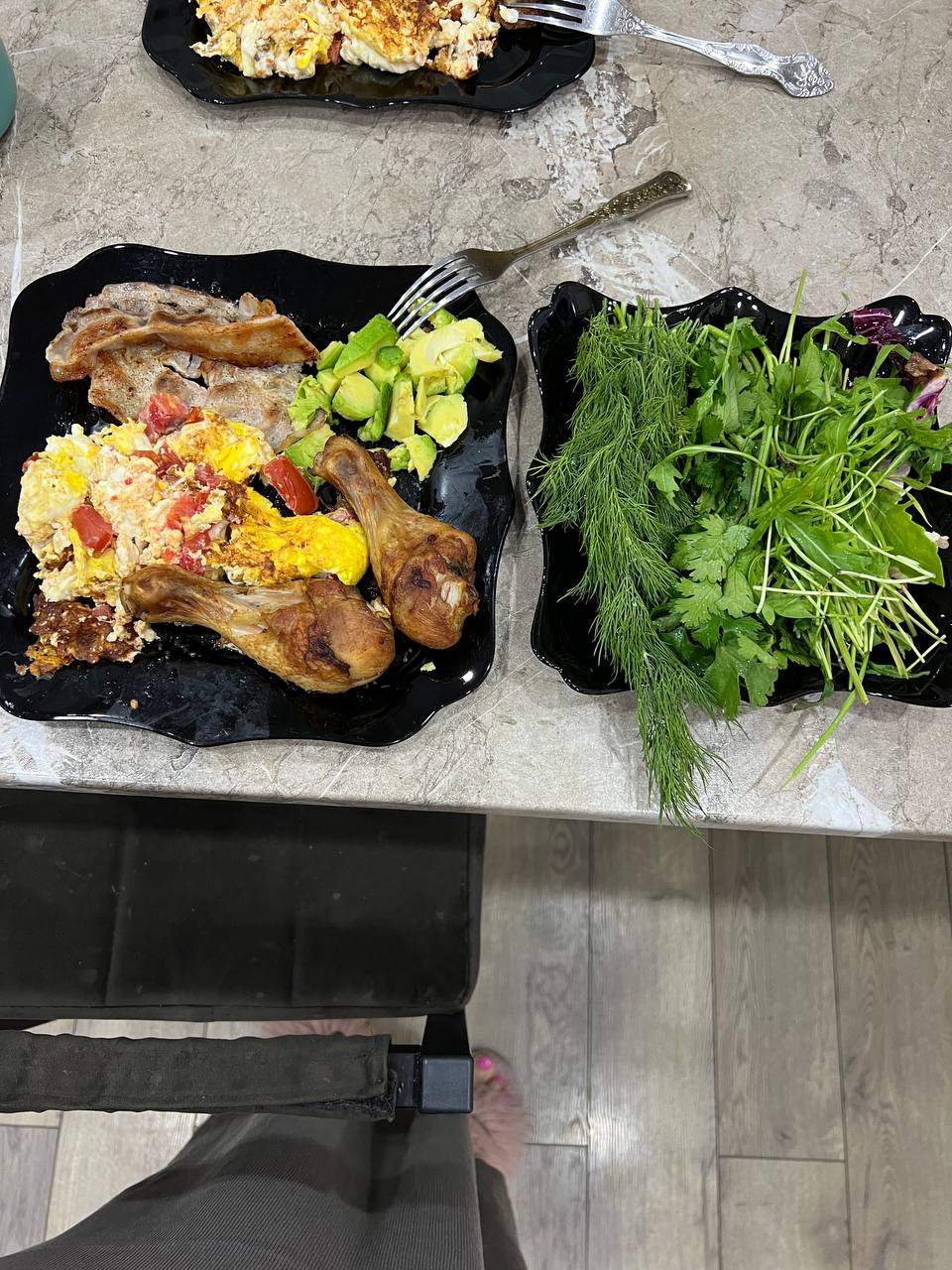 Два фото, там все жарено на жире от бекона, ножки запеченные и съедены со шкуркой. Сегодня были крылышки, бекон и 3 яйца, зелень.