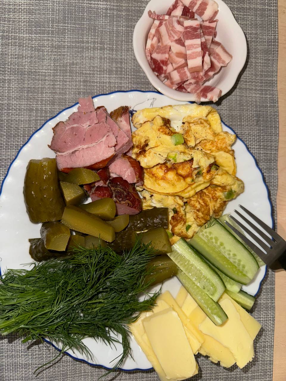Пучок укропа, 2 бочковых огурца( один не съела),пол свежего огурца, копченый фермерский рулет, масло с сыром, омлет из 2 яиц и немного сливок 33% и сало( чуть-чуть не доела).