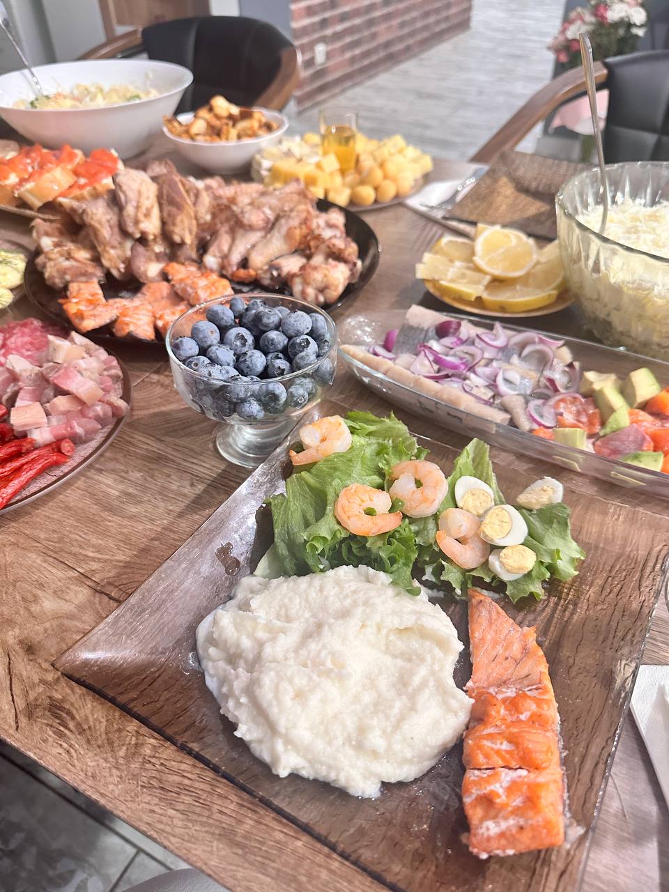 Сегодня годовщина свадьбы, для всех картофельное пюре, для меня- пюре из цветной капусты со сливками, кусочек форели, у всех обычный цезарь, у меня листья салата с креветками)) съем немного ягод на десерт, всяких салатов наготовила, но самой не хочется уже. Сегодня Омад 👌