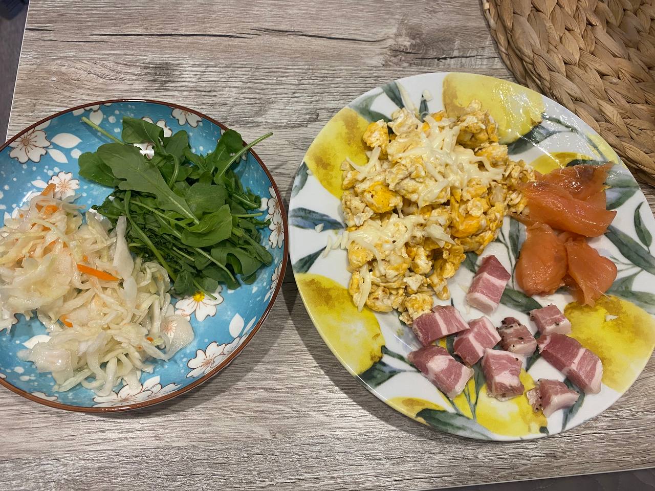 Здравствуйте Сегодня ОМАД 3 жареных яйца с цветной капустой и сыром сулугуни, красная рыба-солила сама, только солью. Сало, зелень руккола и мангольд. Квашеная капуста, 5 орехов фундука. Добавки все пью