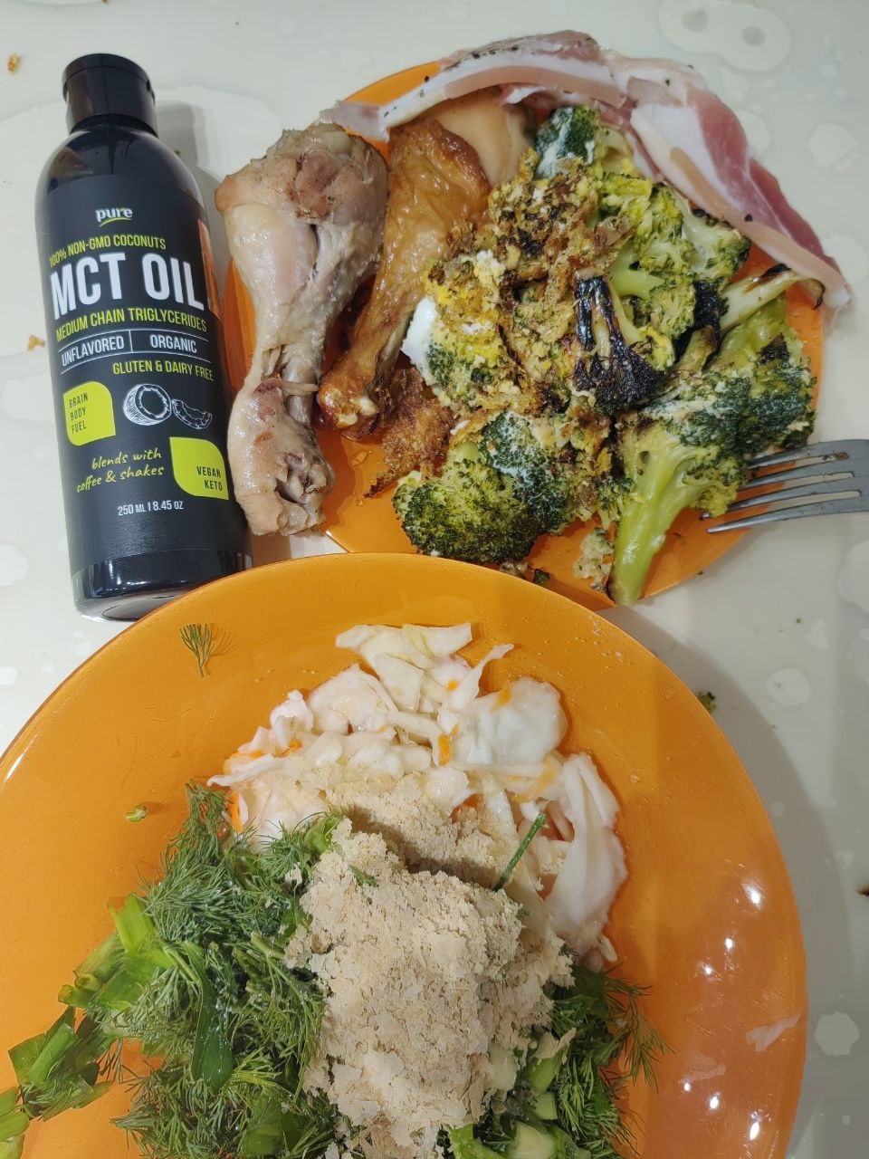 Один прием пиши. Капуста, зелень, дрожжи, полила маслом мст. Сало три кусочка, брокколи в яйце и две ножки в духовке