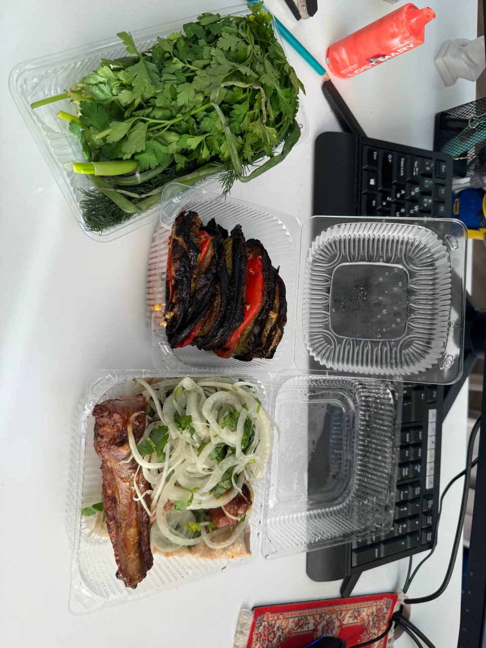 Добрый день! Один прием пищи: шашлык из свиных ребер 300 г,овощи на гриле и зелень